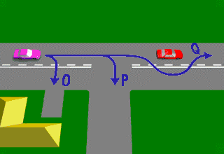 当您在十字路口面对另一辆车时,如果您右转,必须等待直行或左转的车辆。因此,在下图中,车辆P比车辆O具有优先权。