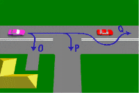 中央车道可能有转弯湾。如果你的车辆不会阻挡其他车辆的路径,你可以转入中央车道并等待。在下图的情况下,车辆Y和O都可以进入车道并等待而不会交叉对方的行驶轨迹。